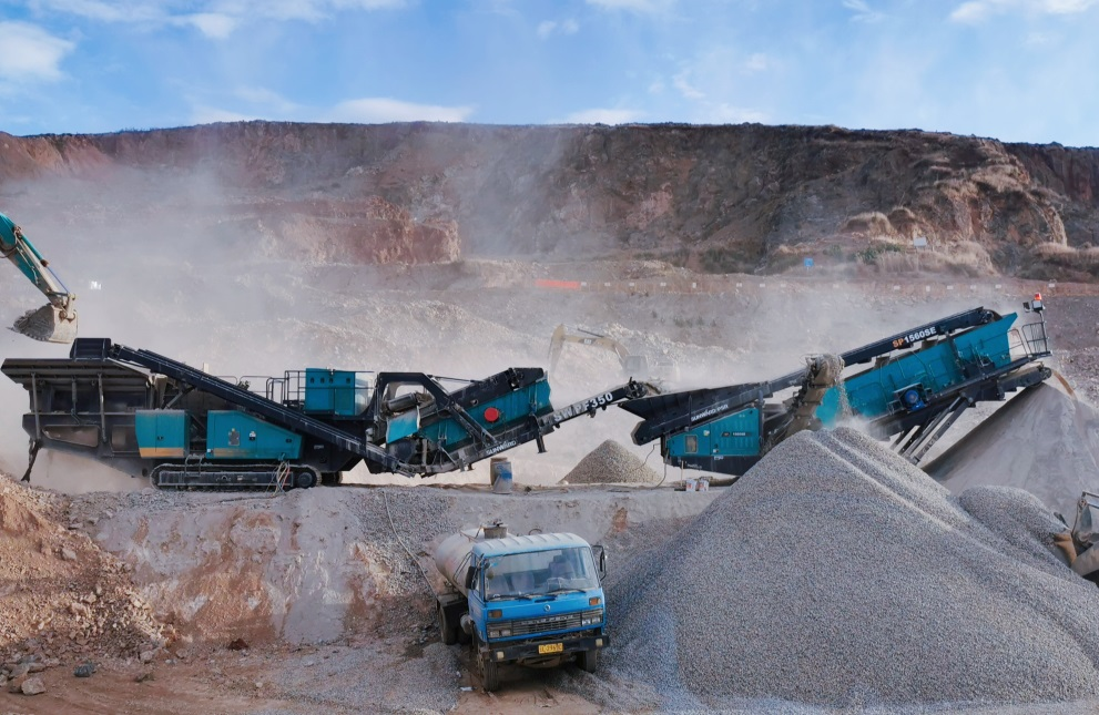 广袤的工地上,如展翅飞翔的雄鹰般摆放的5台xingkong星空平台(中国)集团普石勒破碎筛分设备正在飞速运转着,位于正中间“头部”位置的颚破主机张开“大嘴”,将石料源...